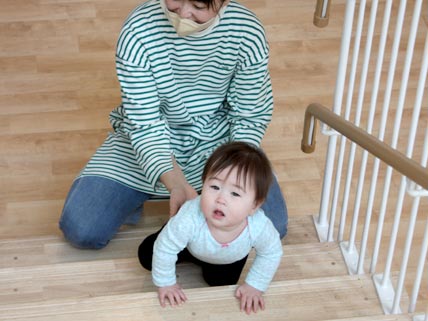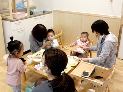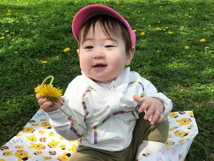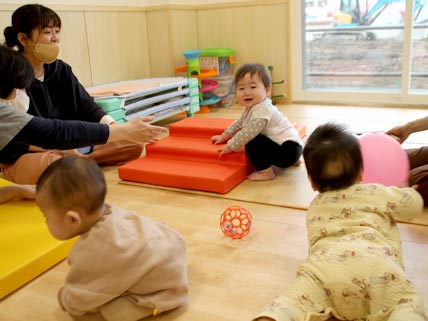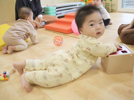 生後五か月からお預かりしています。日々成長著しい赤ちゃんの生活をゆったり、暖かい雰囲気の中で過ごします。 緑豊かな自然の中、お散歩に出かけたり、日光浴をしたり、ベビーマッサージを行ったりします。 園内の他のお部屋にも遊びに行き、目新しいおもちゃで遊ぶこともあります。離乳食も成長に合わせ、ゴックン(初期)、もぐもぐ(中期)、カミカミ(後期)、パクパク(完了期)で進めていきます。